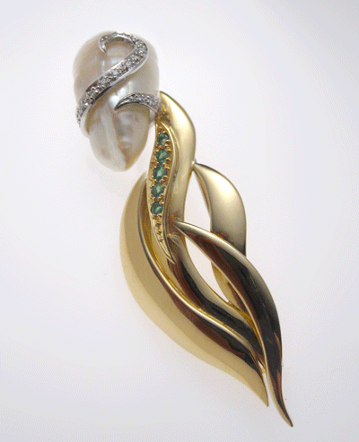 18ct white and yellow gold, freshwater pearl, diamond and emerald.