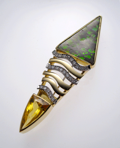 18ct white and yellow gold, 14.31ct ammolite, 0.38cts diamonds, 3.57ct beryl.