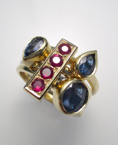 18ct yellow gold, ruby and sapphire stacking rings.