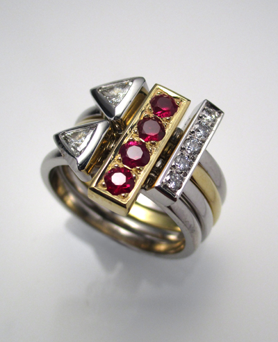18ct white and yellow gold, ruby and diamond stacking rings,