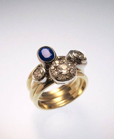 A mix of a single diamond earring, stones from a sapphire and diamond dress ring and an antique diamond cluster reworked into a set of stacking rings.