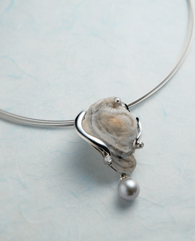 18ct white gold, geode, 0.17ct brilliant cut diamonds, natural grey Tahitian pearl.